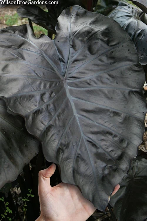 Black Coral Elephant Ear is very easy to grow in most any moist but well-drained soil and full sun to part shade. It prefers a consistently moist to wet soil and will even grow in standing water. Keep an eye on plants growing in containers and provide water if you see the foliage begin to wilt. Feed in spring and again in early summer with a slow-release flower food or natural or organic plant food.